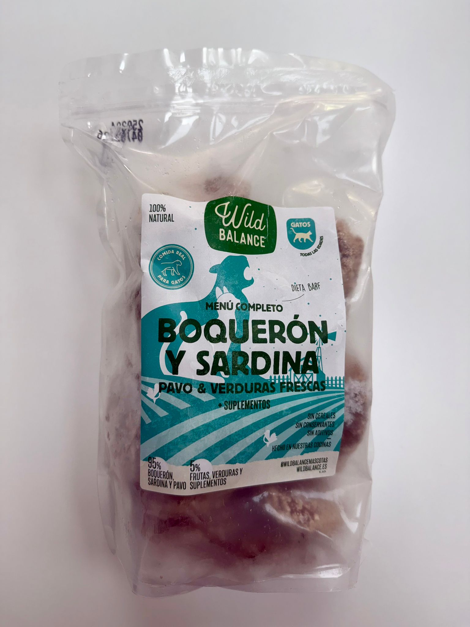 Menú BARF de boquerón y sardina para gatos, con verduras frescas y apto para gatos de todas las edades. Con tres tipos de proteínas, boquerón, sardina y pavo.